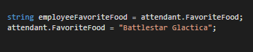 In order to assign the Employee's favorite food, then, we need to do so within the Employee class. Notice how in the Burp method we can assign the private favoriteFood field a value because it is within the same class.