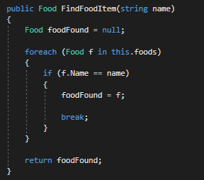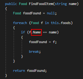 Anytime there is a reference that looks like a method call without any () it is a property. This particular property gets the private name field from the Food class.