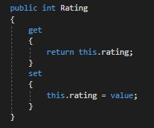 The code has a few getters (IsGood and Name) and then a setter (Rating). The Rating property looks like this: