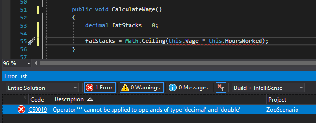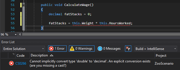 The same can be said of code. For example, in the code below, this.Wage is a decimal and this.HoursWorked is a double. With an error message that basically says "You are trying to multiply a circle with a square, but I don't know how to do that."