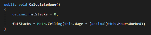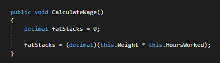 We picked to cast the this.HoursWorked field as a decimal because the variable the equation is being assigned to is a decimal.