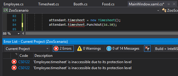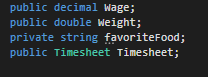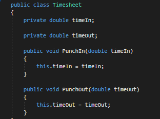Since the Timesheet is public we can instantiate it in the MainWindow and even force the Employee to punch out. This isn't good, however, because only the Employee should be able to punch in and out.