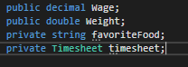 Let's say we want Employees to have their own time sheets. We can create a new class and give them a Timesheet object field.