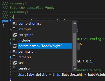 If adding a parameter to a method that previously had a code comment on it, add a new line under the code comment and type /// <p and Visual Studio will auto complete the tag for you.