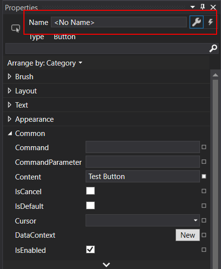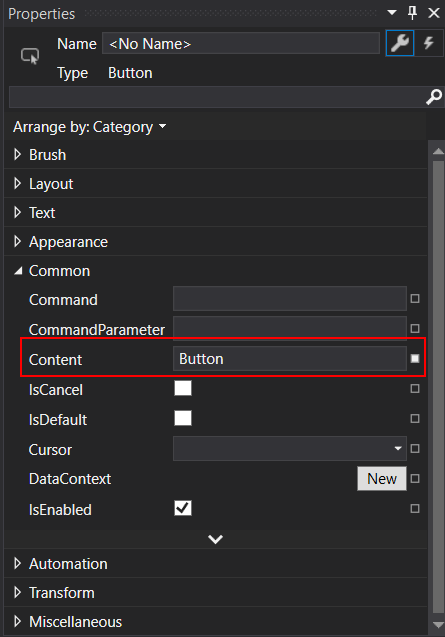 With the button selected, change the Content of the button by editing it in the Properties window. If you do not see the Properties window go to View | Properties Window.