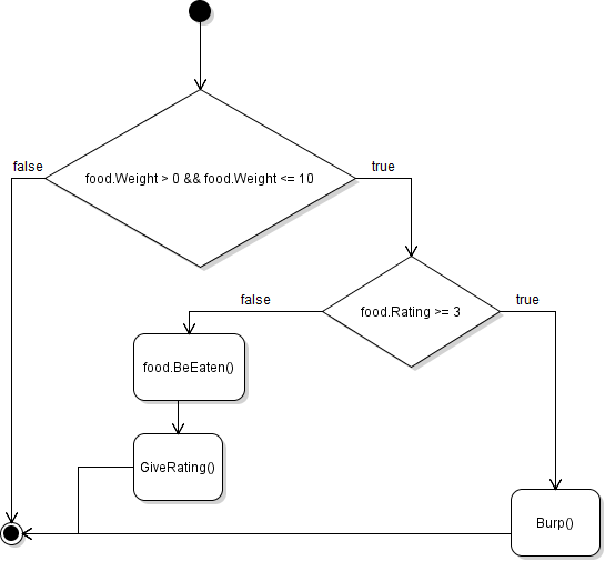 There is first a test about the range of the Weight and if that's true the food will be eaten and given a rating. However, the person should only show their enjoyment of the food by burping if the rating is 3 or higher. If it isn't then they will be silent.