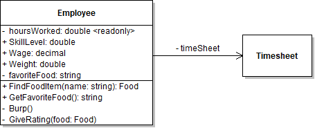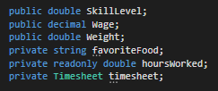 Note that even though the hoursWorked field is private, the readonly field goes on the top of both the public and private fields.
