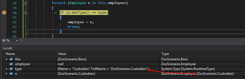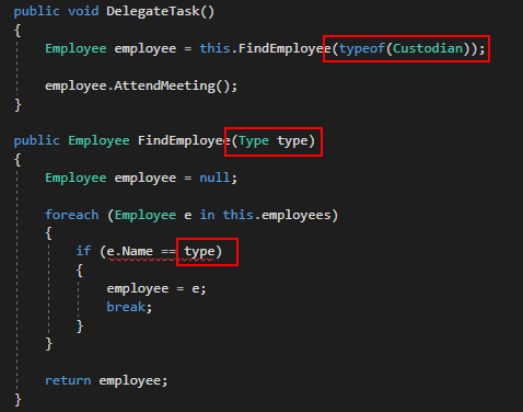 Note that the Value of both the typeof and GetType are identical. This is good new since we want to compare them. To do this we're going to replace the string parameter in the FindEmployee method with a Type parameter and then pass in the Type we want to find as an argument using typeof and change the parameter reference.