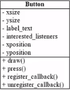 Classes in UML contain the name of the class (Button in the above image), The fields or data of the class, and the functionality or behavior of the class (methods).