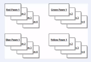 The Parcheesi pawns in memory would look something like this. 16 different objects. There are 16 pawns in memory being represented abstractly. Remember that while there are 16 pawn objects, there is only one pawn class that the objects are derived from. The class can be seen as an abstraction of all 16 of the pawn objects.