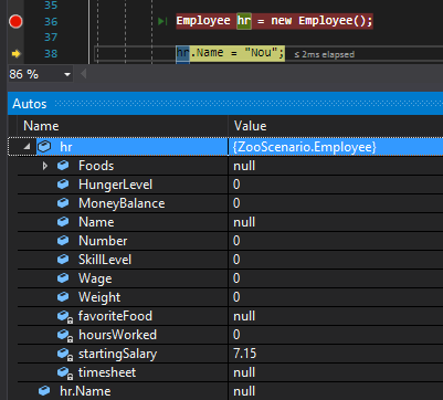 Now if we press F10 on the line that instantiates a new Employee in the MainWindow, notice that all of the other Employee fields are null/0 except for the startingSalary because it is assigned in the constructor when the object is instantiated.