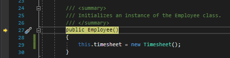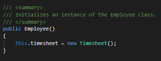 ...but it hasn't been instantiated anywhere. Assuming all Employees need a Timesheet, we can instantiate the Timesheet in the Employee constructor.