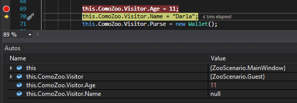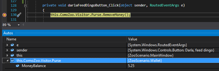 Pressing F11, however, makes the debugger move into the next line of code in the sequence, which means it will step into any methods, constructors, properties, etc. that are called. For instance, if I set a breakpoint on the line of code that calls RemoveMoney...