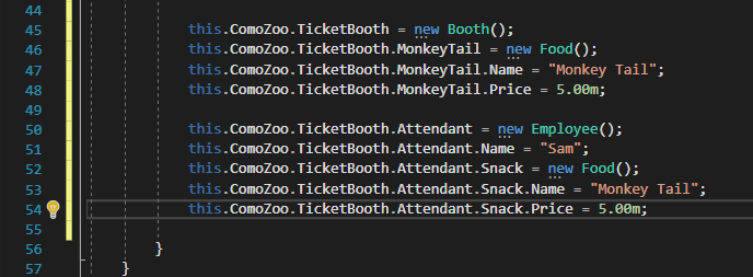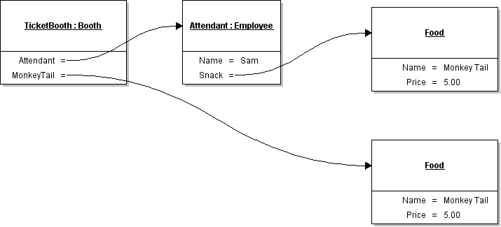 A new ticket booth is defined, a new food is instantiated and has some values assigned to its fields. Then a new Employee is defined and their fields have values assigned to them. Looking at the code it seems like the Booth and the Attendant have the same object (The $5 Monkey Tail) as their Food. While this is true in description they are not the same food item. Because of the instantiation of the items in different places, there are actually two different Food items in memory that have nothing to do with one another.
