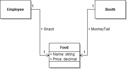 As an example of this at work let's look at a scenario where Sam the attendant of the ticket booth wants to eat a snack at the booth he's working in. Both the Booth class and the Employee class 'have a' Food field. For the Employee it is a Snack and for the Booth it is a MonkeyTail.