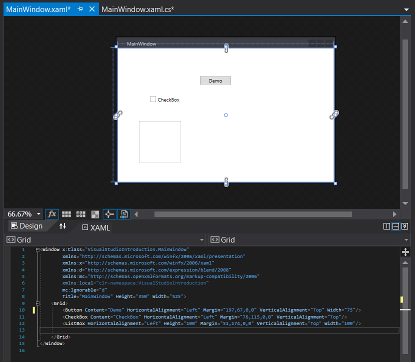 In your VisualStudioIntroduction solution, click on the button and look at your XML. Specifically the Button Content, and note that it is “Button”. Change it to “Demo” and the button in the designer will change.