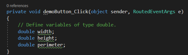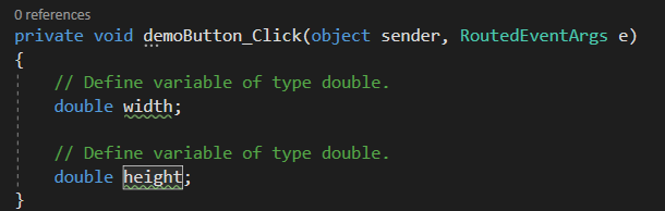 In this event handler we will define a variable. This will also be explained in more detail later. This variable will be named width and be of type double, so type the following as you see below: