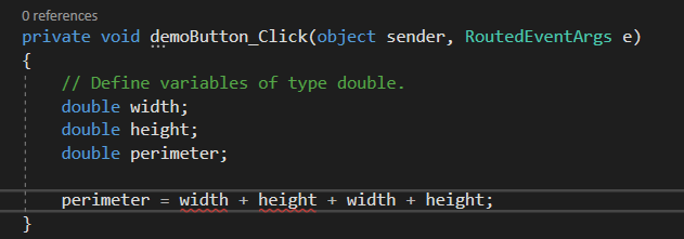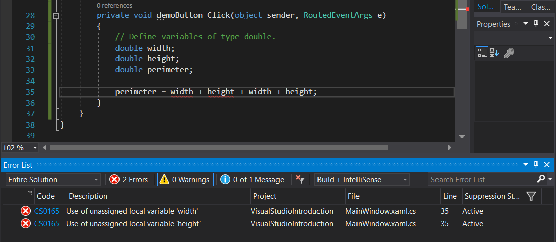 This is logical - there is no way to calculate the perimeter when the width and height are unknown. If you double click on one of the two errors in the Error List, it will take you to the line of code of the error. Thankfully these particular errors are very easily fixed, and can be done so by assigning the width and height parameters a value.