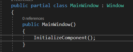 But more about the MainWindow.xaml.cs. This is a Window object. Windows and other classes are housed inside of namespaces. Namespaces contain curly braces, and if your cursor is near a curly brace, it will highlight the other curly brace that it is corresponded to.