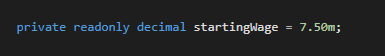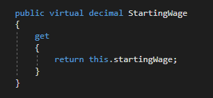 Let's say we have a scenario where we want to get the starting wages of all our employees. We have a virtual property in the Employee class that returns a readonly value.