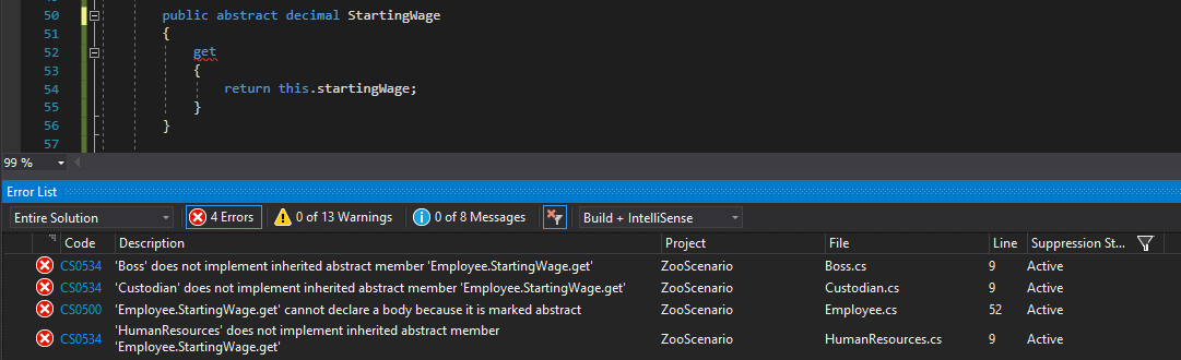 Notice that we now get a number of errors. The errors that are in the Boss, Custodian and HumanResources classes are saying that we have declared a property abstract but don't have an override in these classes. This error can also be shown when hovering over a class definition that isn't implementing abstract members.