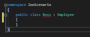 ...but Visual Studio is still mad about not being given any arguments for the Employee constructor, however, so we are going to say, "okay, all of the arguments that I passed into the Boss constructor, those should be used for the Employee constructor." To do this, we call the base constructor and pass in the arguments passed into the Boss constructor.