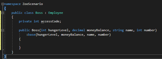 Many times a descendant class will have fields that are unique to them that needs to be assigned to in the constructor. For this example we will revisit the Boss inheriting from the Employee class. So far we have a constructor that passes values to the Employee constructor.