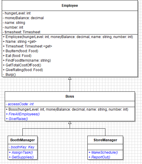 Now the BoothManager has everything the Boss and Employee classes have as well as a field that is only applicable to them and two fields only a BoothManager type can use. In much the same way, the StoreManager has everything the Boss and Employee classes have as well as two methods that only StoreManager types can use.
