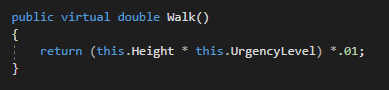 For example, let's define a method named Walk that returns 10% the Height of the Employee multiplied by their UrgencyLevel.