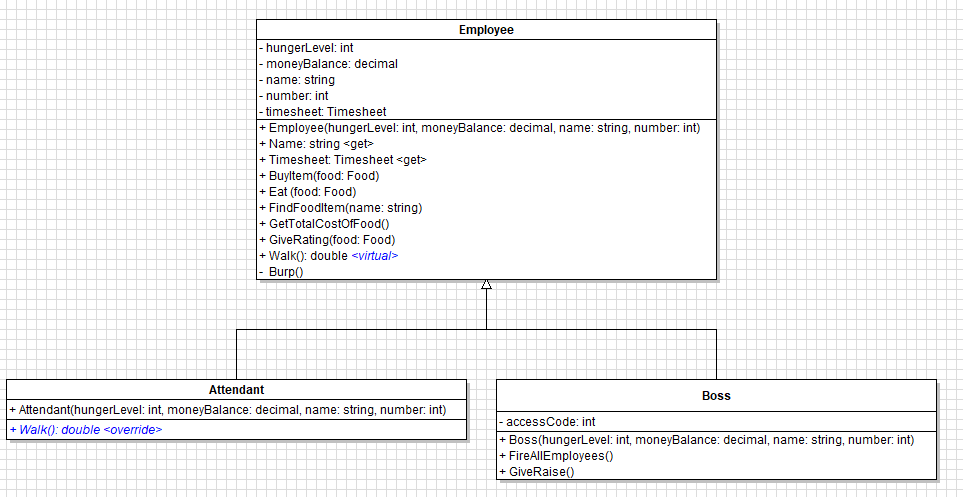 At this point every single class that descends from Employee has to use this method if they want to Walk, which represents the average walk speed. This is somewhat of an issue, though, because the Boss says that Attendants should be faster when they walk because they have more to do. We can't change the Walk method just because of that, though, because then our lazy boss would have to walk way faster than they want to. To make this work, then, we will make the Walk method virtual.