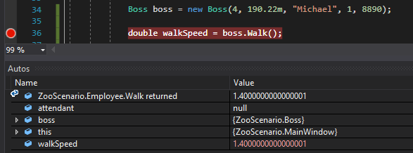 Let's say our Boss object has a Height of 70 and an UrgencyLevel of 2. His speed comes back as being pretty slow since he doesn't have an override and the Employee class's Walk method executes.