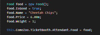 If we run the application and step over the line of code that assigns the food object to the Employee's Food field we can see that the field is the same as the food object.