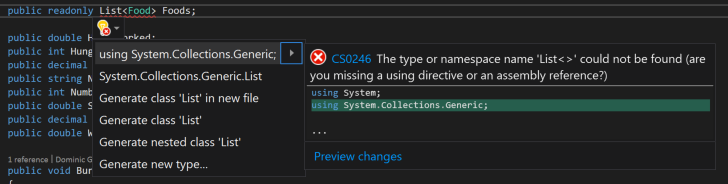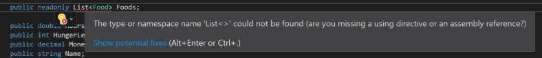 What we need to do, then, is add a using statement. To do this, hover over the List class, click the lightbulb, and select using System.Collections.Generic. Once this is done the error will go away.
