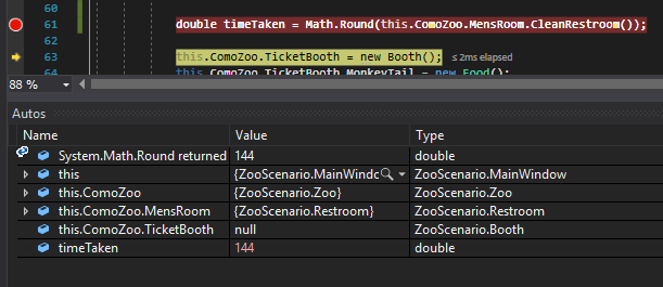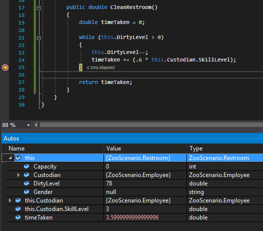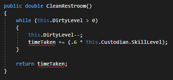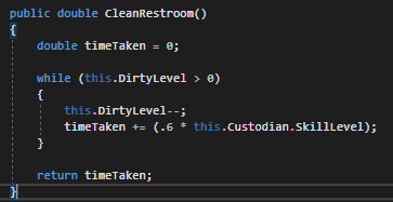 The next things we do is define a while loop that reduces the DirtyLevel by 1 and then increases the timeTaken by 60% of whatever their skill level is.
