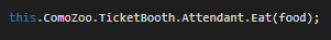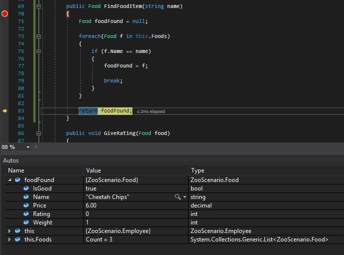 Now we can pass in the foundFood variable as a parameter to the Eat method instead of forcing Sam to eat Meatloaf forever.
