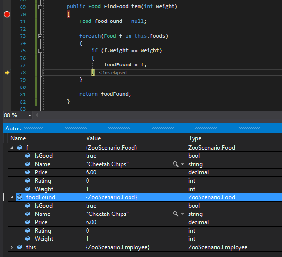 ...so the conditional will evaluate to true. When we press F11 the debugger will assign the foodFound variable to the current food item...