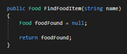First we want to define the skeleton of the method. We want to return a type of Food and we want to be comparing to the name of the food Sam wants to we need to pass in an argument to compare to.