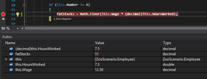 Now when we run the application and execute that line of code the fatStacks variable is assigned the value 93 instead of the 93.75 that it would be without the call to Floor.