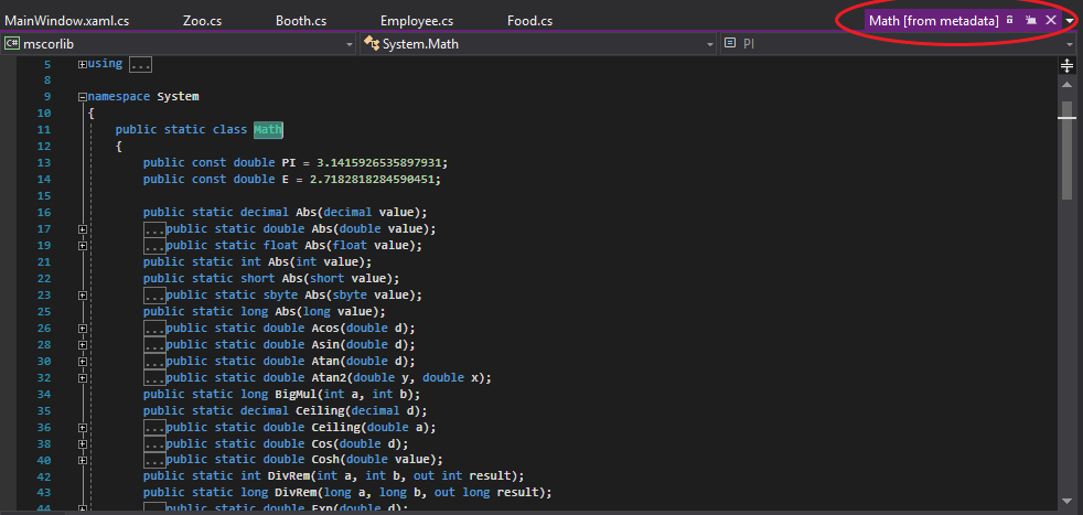 The Math class has a number of different methods we can use. To see everything that it has, press F12 on the Math class and Visual Studio will bring you to the class.