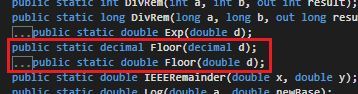 What is unfortunate about this view is that we cannot see how each method is designed, but what we can see is what is needed in order for it to work properly. For instance, with our use of Floor, we can see that it requires either a decimal or a double as an argument and returns a decimal or a double depending on what has been passed in.
