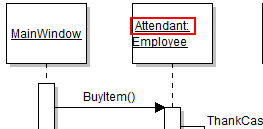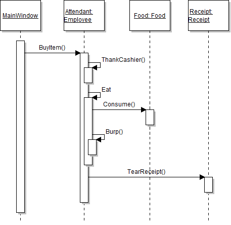 So all together we can say that there is a call to BuyItem on the Attendant object from the MainWindow. This is represented in code as: