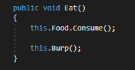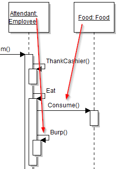 However, we aren't finished, yet. The sequence diagram shows two calls coming from the Eat method. The Consume method being called on the Food object and the Burp method being called on the current instance.