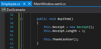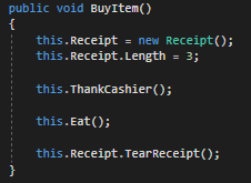 The TearReceipt method is called from inside the BuyItem method but "lives" in the Receipt class. The code for this looks like: