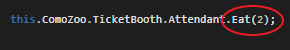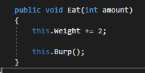 In the case of the Eat method, it 'wants' an amount of type int. So in the call to Eat in the MainWindow, we can pass in 2.