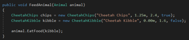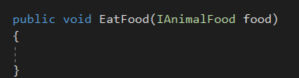 But wait, the CheetahKibble implement IAnimalFood! We can change the parameter type from Food to IAnimalFood.