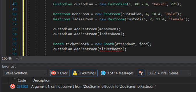 As we would expect, though, if we tried to add a type of Booth to the list we would get an error because the AddRestroom method only takes Restroom types.