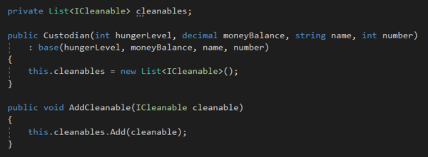 Let's say the Custodian of the Zoo wants to go around to everything they can clean and clean it. We have two things in our Zoo (Booth and Restroom) that are cleanable things. The custodian already has a list of restrooms that we can add a Restroom object to just fine.