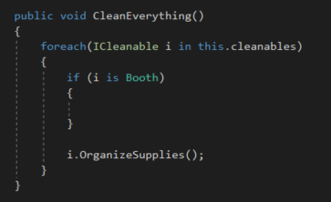 Let's say the Booth has a method called DustCounter that isn't part of the ICleanable interface? If the Booth is an ICleanable when looping through the list, that method will never be available to us. So we need to cast it. The first thing we are going to do is check if the object is a Booth.
