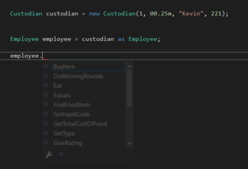 In the previous example we implicitly casted the Custodian type to an Employee type, but we can also explicitly cast it by using the as keyword.
