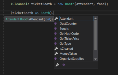 But we know that the Booth has other members that are more specific to Booth objects we want to access. What we can do then is us the as keyword to make the ticketBooth a more specific Booth type.